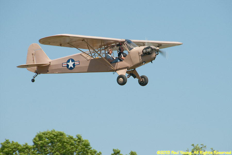 Ground school, and then pushing the 1942 L-4 from its tiedown to the fuel pumps. This is the military version of a J-3 Cub. It's not yellow, and it has lots of windows in the back. On this very hot and very windy day, we left the side window completely open, both top and bottom.